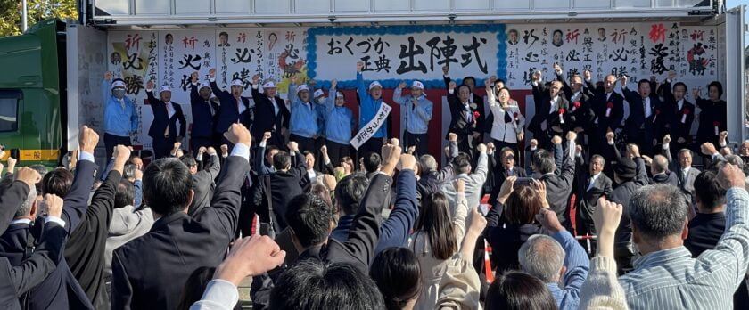清々しい秋空の下、朝早くより、多くの方に集まっていただきありがとうございました。 ガンバローコールを頂き、皆様の絶大なるご支援を糧に、おくづか正典、元気よく出発いたしました。